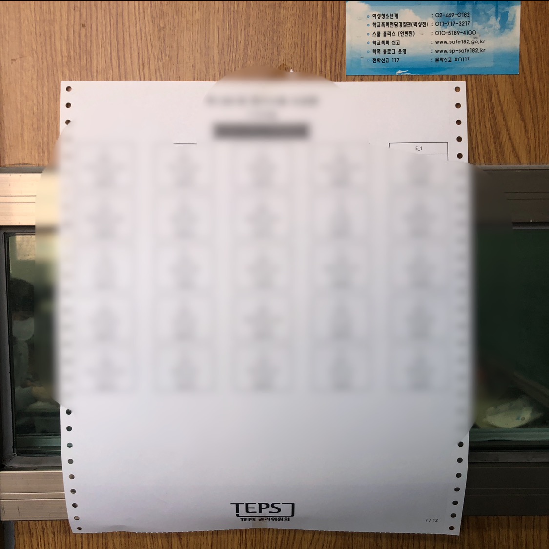 수험장에서는 14시50분이 넘으면 입실불가라고 안내되어 있었습니다. 고사장에 들어가면 입구에 수험 번호와 성명, 태어난 월일이 모두 기입된 고사장 안내 표지가 있습니다. 사진을 찍진 않았으나 이름과 월일이 모두 공개가 되니 음… 개인정보보호가 전혀 되지 않는 텝스 고사장이라고 생각합니다. 제가 시험본 고사실은 3층에 있었습니다. 제가 본 교실은 중학교 3학년 교실이었고, 교실의 학급번호판에 고사실 번호가 붙어있고, 앞쪽에 고사실 자리배치가 있습니다. 텝스 (TEPS)고사실은 ABCDE열 총 5열에 1-5줄까지 총 25명이 시험을 볼 수 있었습니다. 보통 자리배치는 A1부터 E5까지 되는데요. 그리고 가장 끝에 빈책상도 놓여져 있었습니다. 그래서 신분확인이 모두 끝나면 좌석을 옮길 수 있도록 배려도 해주었습니다.