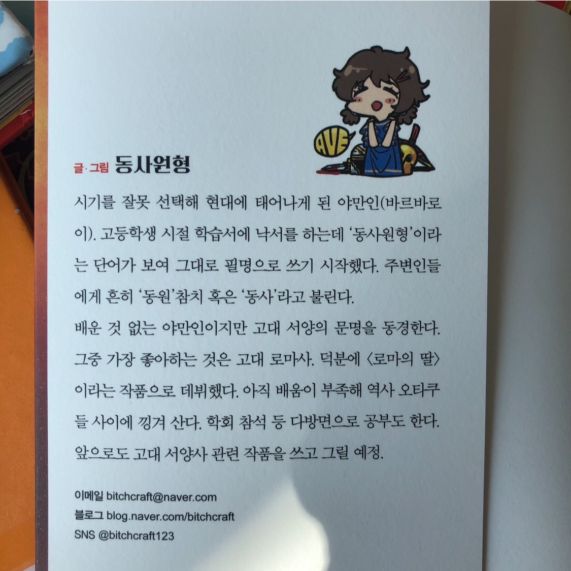 작가님은 고대 서양의 문명을 동경하며, 특히 고대 로마사에 대한 관심이 많습니다. 이로 인해 ‘로마의 딸’이라는 작품으로 데뷔하게 되었으며, 이후에도 고대 서양사와 관련된 작품을 계속해서 쓰고 그리고 있습니다. 작가님은 학회 참석 등 다방면으로 공부를 하며 계속해서 성장해 나가고 있다고 합니다. 또한, 감수를 맡은 강대진님은 서울대학교 철학과 졸업 후, 서양고전학 협동과정에서 일리아스 연구로 박사 학위를 받은 학자입니다. 현재는 정암학당 연구원과 경남대학교 연구교수로 활동하고 있습니다.