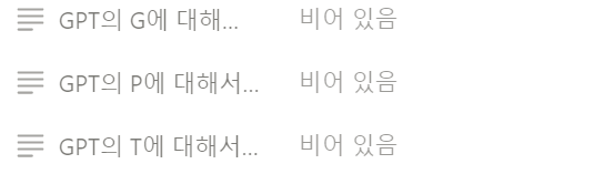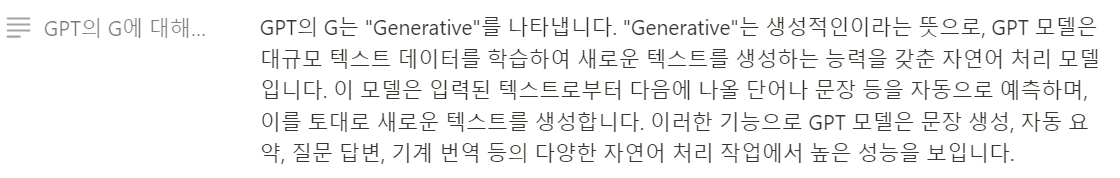이러한 과제를 학생들에게 제시하였더니, 학생들은 10분도 채 되지 않아서 노션에 다음과 같이 챗GPT의 GPT 개념을 정리하였습니다.