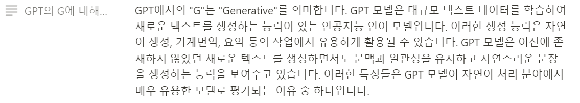 GPT의 G는 "Generative"를 나타냅니다. "Generative"는 생성적인이라는 뜻으로, GPT 모델은 대규모 텍스트 데이터를 학습하여 새로운 텍스트를 생성하는 능력을 갖춘 자연어 처리 모델입니다. 이 모델은 입력된 텍스트로부터 다음에 나올 단어나 문장 등을 자동으로 예측하며, 이를 토대로 새로운 텍스트를 생성합니다. 이러한 기능으로 GPT 모델은 문장 생성, 자동 요약, 질문 답변, 기계 번역 등의 다양한 자연어 처리 작업에서 높은 성능을 보입니다.