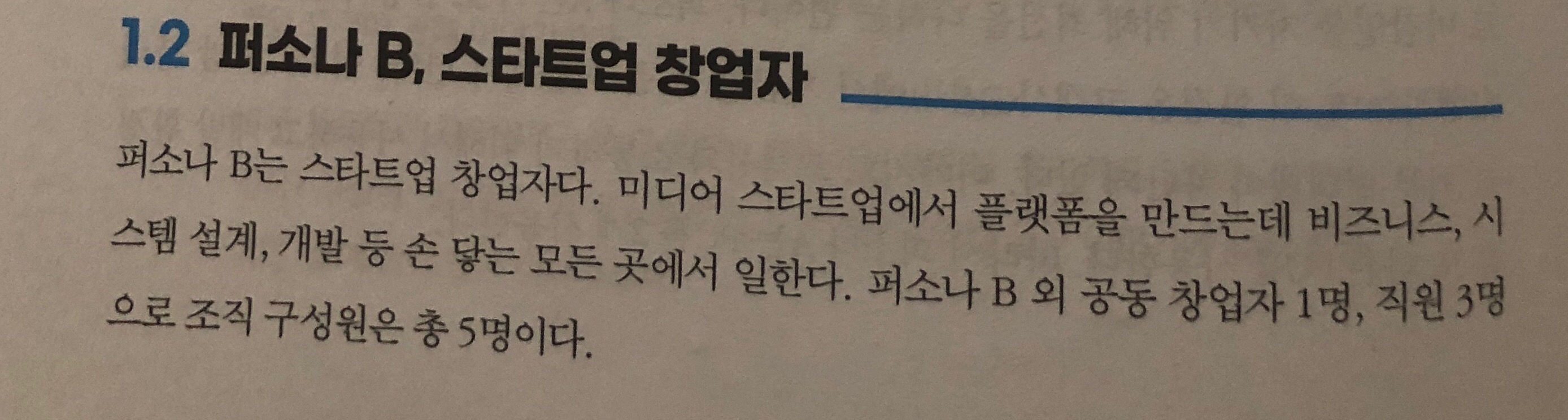 퍼소나 B는 스타트업 창업자다. 미디어 스타트업에서 플랫폼을 만드는데 비즈니스, 시스템 설계, 개발 등 손 닿는 모든 곳에서 일한다. 퍼소나 B 외 공동 창업자 1명, 직원 3명으로 조직 구성원은 총 5명이다.