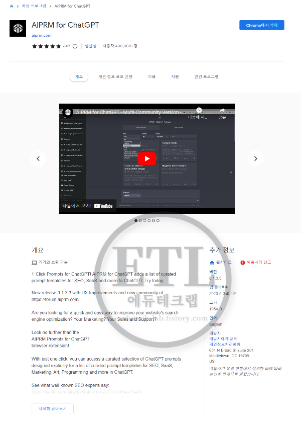 - AIPRM for ChatGPT : AIPRM for ChatGPT는 챗GPT와 함께 사용하는 기능적인 확장 프로그램입니다. 이를 통해 자동 응답 기능, 대화 내용 저장 기능, 사용자 정보 관리 기능 등을 제공합니다. 또한, 사용자의 대화 데이터를 분석하여 더욱 효율적인 대화가 가능해집니다.