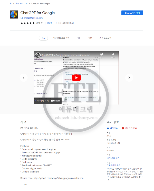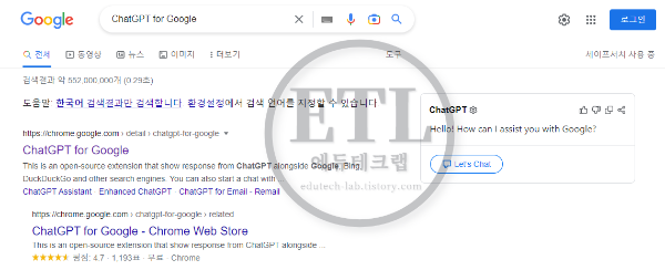 ChatGPT for Google을 설치하면 구글 검색창 우측에 ChatGPT 결과가 함께 나옵니다.
