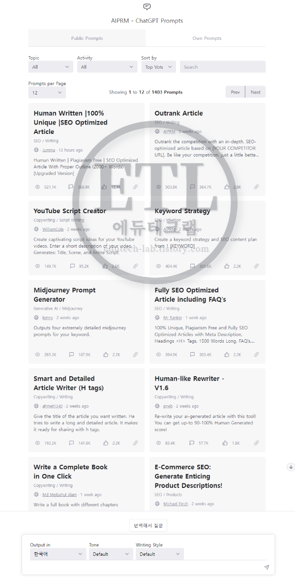 AIPRM for ChatGPT를 설치하면 아래와 같은 프롬프트 옵션을 활용할 수 있습니다.