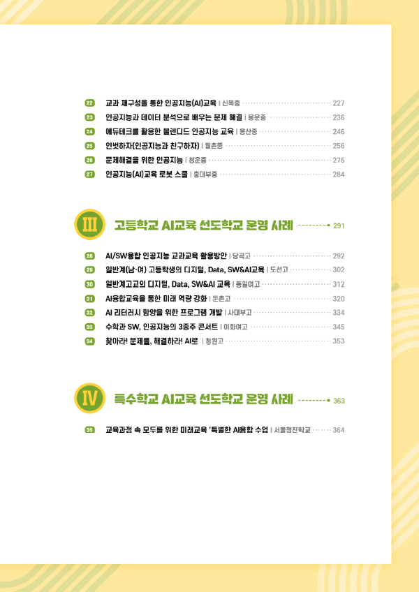 · 초등학교 AI교육 선도학교 운영사례 · 중학교 AI교육 선도학교 운영사례 · 고등학교 AI교육 선도학교 운영사례 · 특수학교 AI교육 선도학교 운영사례 |