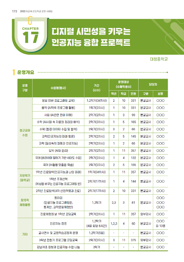 AI교육 선도학교 운영 사례집에서 대청중학교의 7과목(정보, 음악, 사회, 수학, 과학, 도덕, 국어)에 연계한 AI 교육 활동이 상당히 인상깊었습니다.