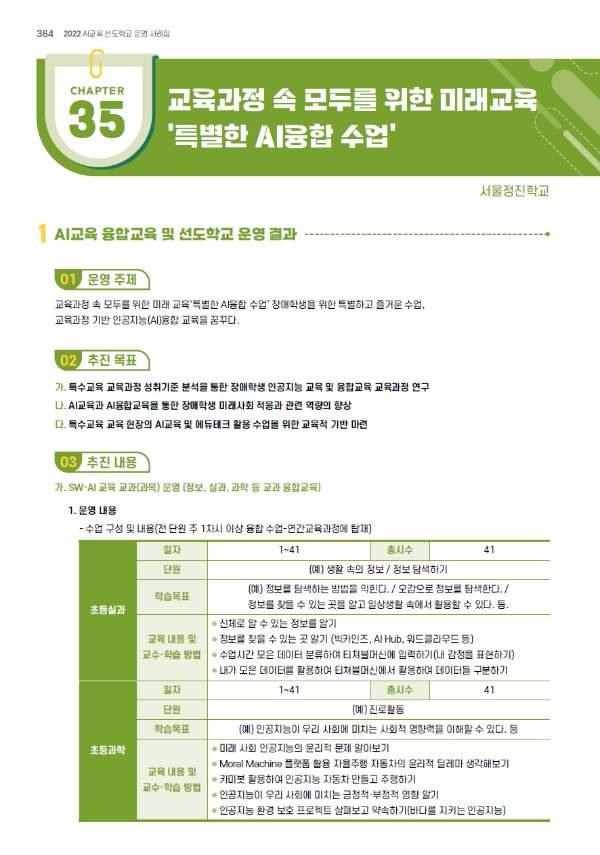 서울시교육청 홈페이지를 통해 배포한 인공지능(AI)교육 우수 사례집 2종은 AI 기반 융합교육을 활성화하기 위한 우수한 사례들을 모은 자료입니다.