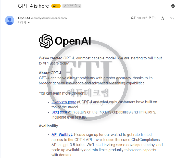 아니나 다를까 Open AI에서 GPT-4 안내 메일이 왔습니다.