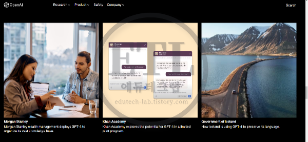 GPT-4 개요 페이지 및 초기 고객이 이 모델을 기반으로 구축한 것.