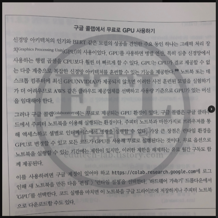 끝으로 구글 코랩에서 무료로 GPU를 사용할 수 있다는 정보도 함께 제공을 합니다. 대부분의 파이썬 책은 구글 코랩보다는 주피터 노트북을 주로 사용하고, 이를 기반으로 설명합니다. 그런데 컴퓨터에 GPU가 없는 경우 머신러닝 구동이 상당히 더딥니다.