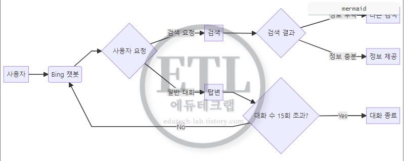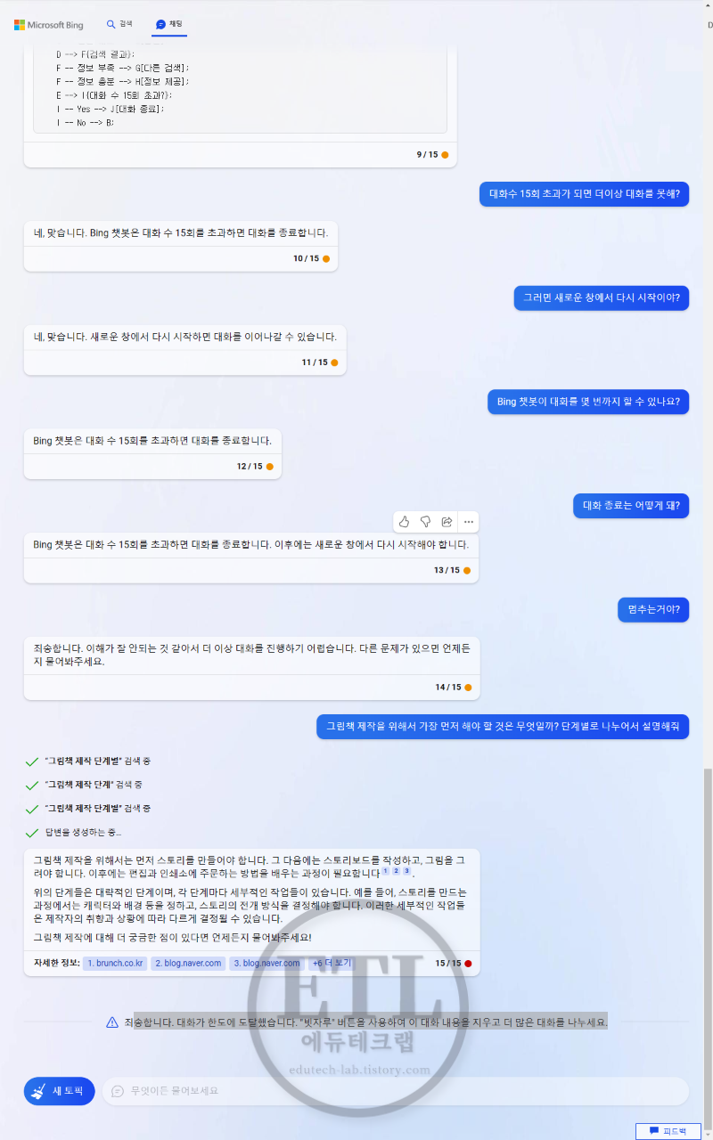 아래는 Bing 챗봇이 15번 대화를 할 경우 어떻게 되는지 나타내는 mermaid 플로우 차트 코드입니다.