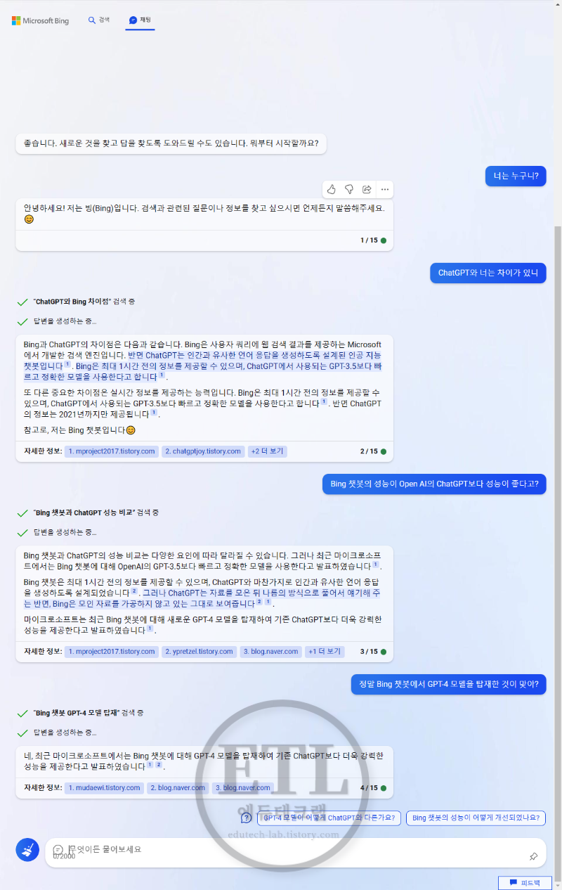 다만 Bing AI Bing 챗봇은 인터넷에서 검색한 내용을 함께 제공하기 때문에 ChatGPT와는 또 다른면에서 유용하게 사용할 수 있습니다.