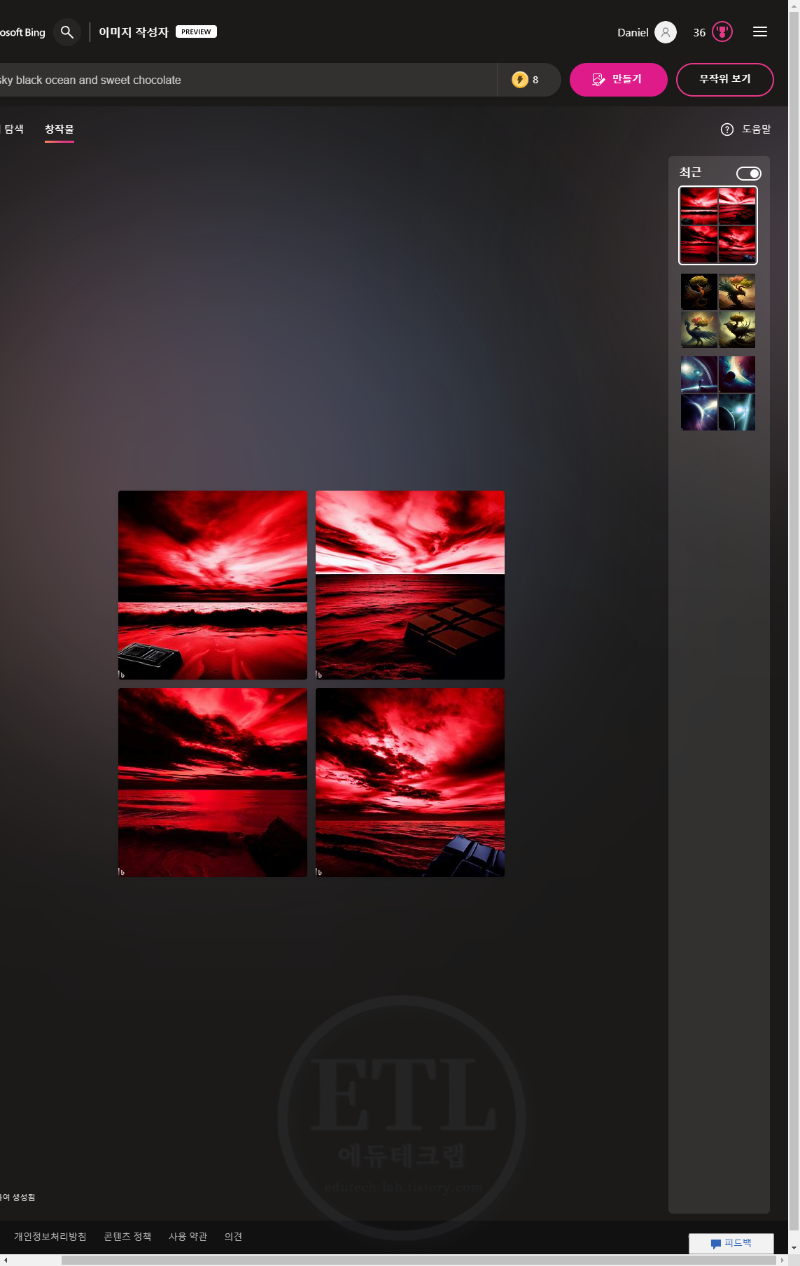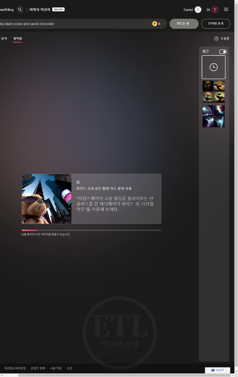 그리고 Bing AI Bing 챗봇과는 다르게 ‘빙 이미지 크리에이터’ (Bing Image Creator) 는 최근 생성한 이미지를 저장하기에 확인할 수 있습니다.