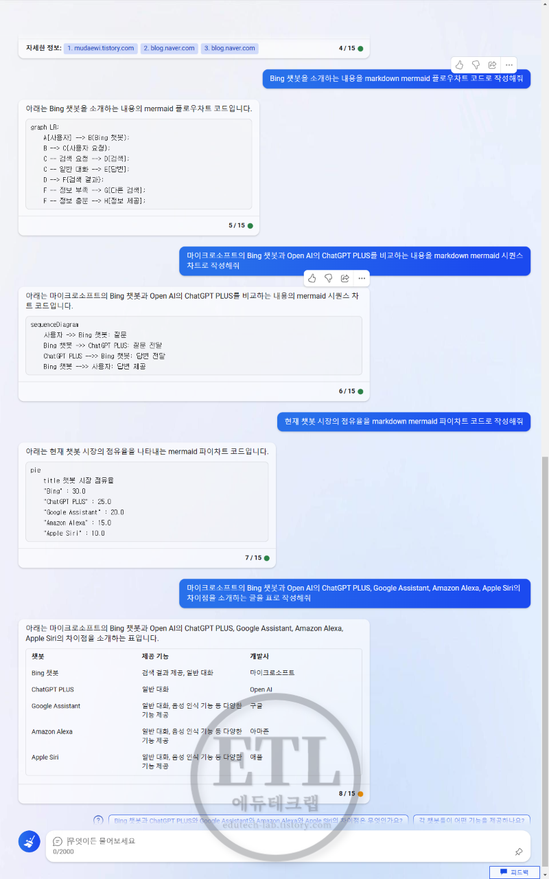 | Bing 챗봇 | 검색 결과 제공, 일반 대화 | 마이크로소프트 |