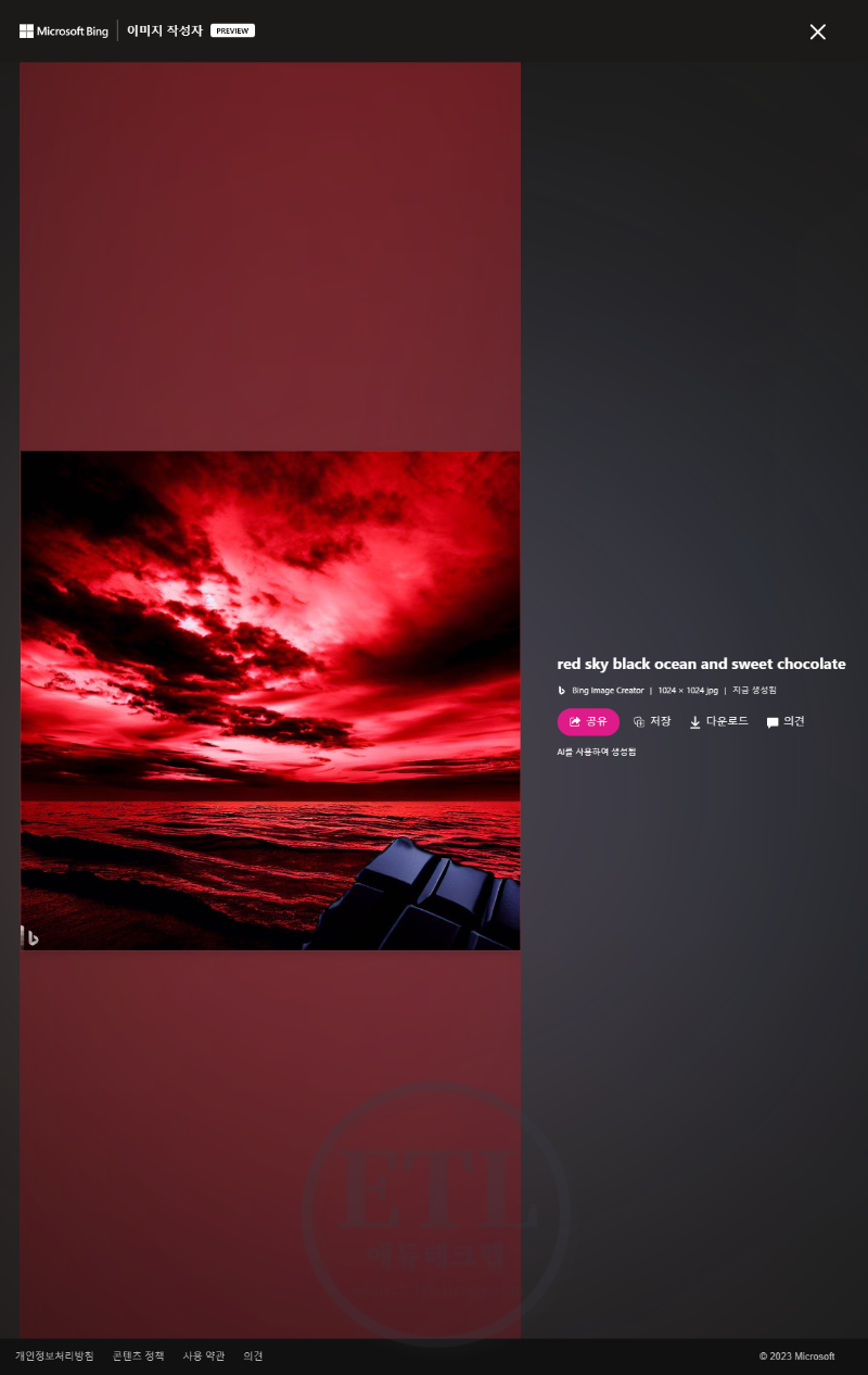 생성한 이미지는 공유, 저장, 다운로드 의견 등의 명령어를 사용할 수 있습니다.