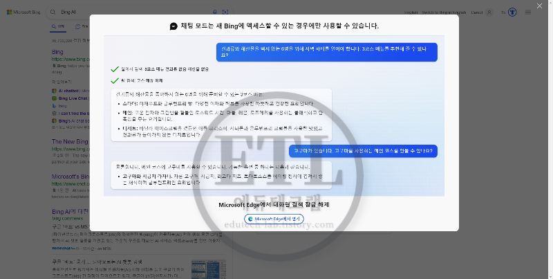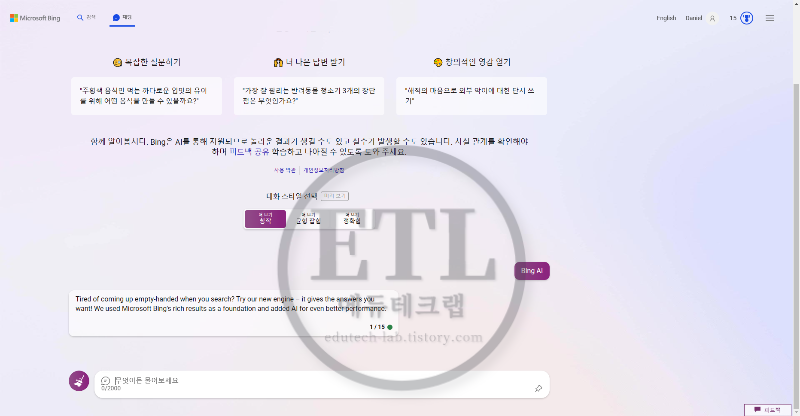 마이크로소프트 엣지로 접속을 하면 다음과 같은 Bing AI가 나옵니다.